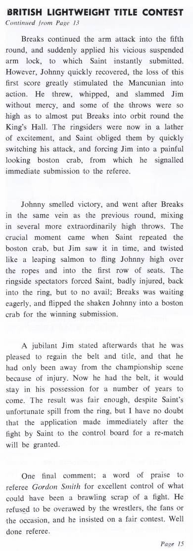 | Breaks pins Albert Sanniez | "Breaks Special" on Vic Faulkner | Headlock on Paco Pastor |