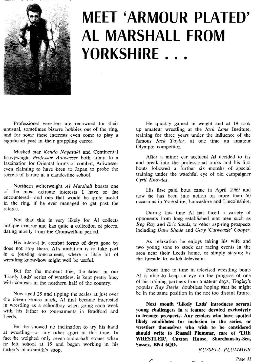 The Wrestler magazine's Russell Plummer featured Al Marshall, and much of the above story, on his 1972 "Likely Lads" page.